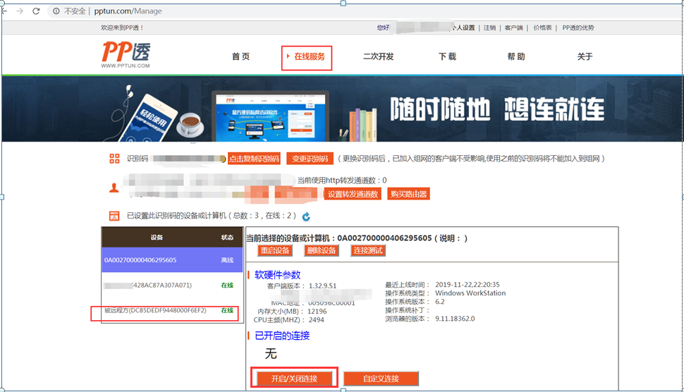 #3.确保所有的客户端都设置了识别码后,最后用pp透的模板开通teamview连接。登录到pp透网站上,点击“在线服务”,先找到之前特别标注的“被远程方”,然后配置模板连接就算成功配置了。